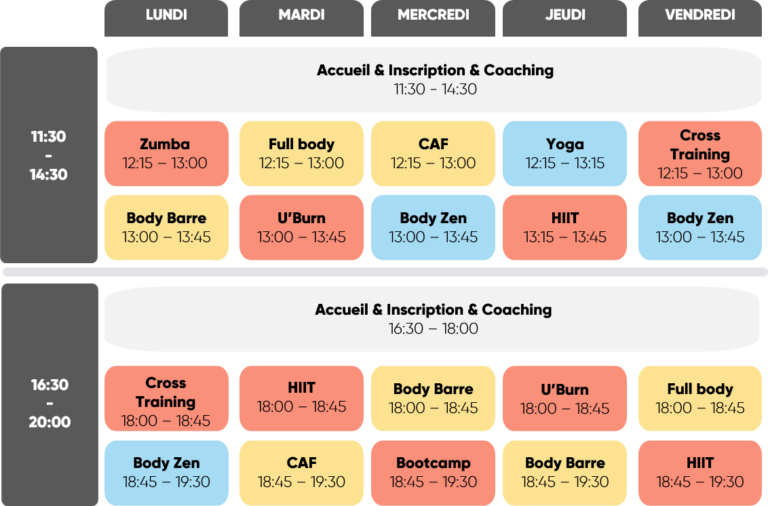 Nous recommandons de réserver nos cours collectifs en ligne. Vous pouvez réserver vos cours jusqu’à 7 jours à l’avance. Une confirmation vous sera adressée par courriel pour toute réservation à un cours.